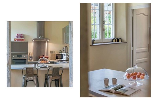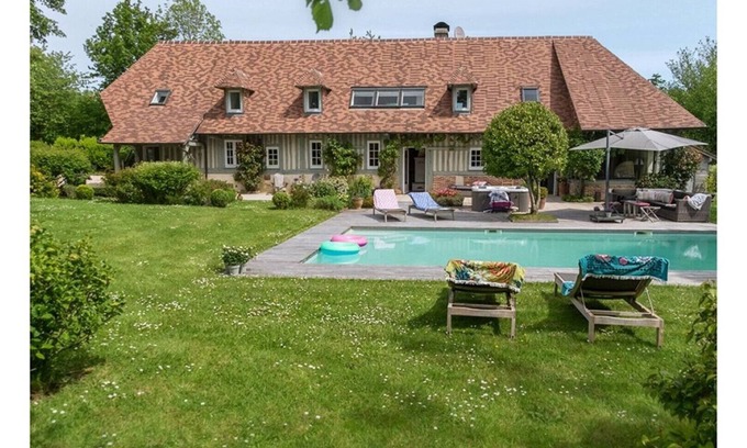 Furnished tourism classified 4 *. 25 minutes from Deauville and the beaches. Authentic 18th century wine press decorated and decorated in a Chic Countryside spirit combining charm, comfort and modernity. Our Norman "Datcha", with high-end services and facilities, offers activities for all ages and all ages! Heated pool 5 x 11, jacuzzi, trampoline, table tennis, table football, Play Station 4, Netflix, brazier ... With family, friends, super active or not, you will love the countryside! Housing : 5 bedrooms, 3 bathrooms, 3 toilets, 5 relaxation areas (minimum stay of 3 nights in July-August) * The house offers 5 relaxation areas: - main living room with large fireplace, TV with Sonos sound, Netflix, DVD player, DVD collection - Games room with table football, various toys, board games - library (books and comics for all ages) with workspace (office) Upstairs : - TV area, Netflix, PlayStation 4 with many games available and Wii - relaxation lounge on the landing * The house has 5 bedrooms, 3 bathrooms and 3 toilets Maximum sleeping capacity: 11 adults + 1 baby + 1 young child Each room is equipped with a double bed. Two bedrooms have their own shower room. - Bedroom 1: 1 bed of 150 (with shower, washbasin, WC) - Bedroom 2: 1 bed of 160 - Bedroom 3: 1 bed of 140 - Bedroom 4: 1 bed of 140, 1 bed of 90 and a space TV and video games - Bedroom 5 (ground floor): 1 bed 140 (with shower and sink). We can add 1 cot and a mattress (70 X 130) for a toddler. - A separate bathroom upstairs (bath + shower). - 2 separate toilets (1 on the ground floor and 1 on the floor) * Super equipped kitchen for gourmets: a real choice of quality utensils for cooking or baking, several robots (Kitchen Aid, Magimix ...). Available: waffle maker, crepe maker, raclette, pierrade, panini grill ... Dining room with Alsatian wood stove * Laundry room with 2nd fridge-freezer, washing machine, dryer, iron and ironing board Wi-Fi throughout the house and around the pool Sonos Wi-Fi Speaker Alarm connected to a central monitoring station * Garden of 4000 m2: - the main facade of the house and the terrace are facing south - swimming pool (5 X 11 m) heated to 29º from April to September (electric shutter). We can advance or extend the opening of the pool depending on the weather conditions at the beginning and end of the season. - jacuzzi (available all year round) - Ping pong table - maxi trampoline - playground (swing, slide, sandpit) - 2 outdoor tables - outdoor sofa, deck chairs, hammock, umbrellas - solar shower - Gas BBQ and wood fire pit for a little cool evenings - electric heated parasol - night lighting * The price of the stay includes: - Beds made on arrival - 2 towels and 1 pool towel per person, kitchen towels - Hair dryer and Nuxe welcome products in each bathroom - Baby kit (cot, baby cloth, high chair, changing mat, bathtub) - Toddler ground mattress - Some basic products in the kitchen - Wood for the fireplace, the stove or the brazier - Gas for the BBQ