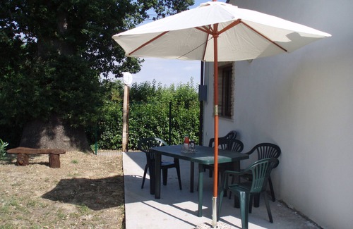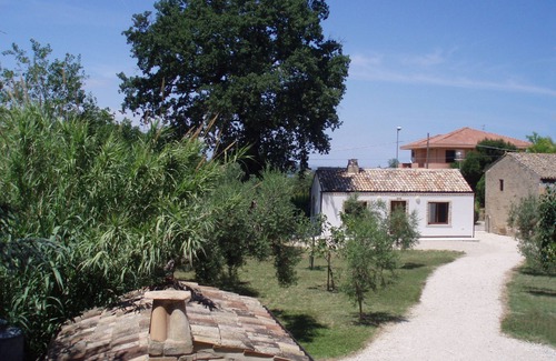 Built in a traditional style where an old barn once stood, with a roof of old pantiles over wooden beams, a decorative cornice of old bricks and brick surrounds of windows and door. Set well apart from the main house in a garden of olive and fruit trees, on a hill which overlooks the sea, amid vineyards and olive groves, in a rural hamlet now being developed as a holiday area because it is near to the beach. Sleeps 4 to 6 people: 2 double bedrooms and a sofa bed in the living room, which also has 3 wicker armchairs and an open fireplace. In the kitchen there are a sink, draining rack, gas hob, cooker hood, electric oven, microwave, fridge-freezer, dishwasher and washing machine. The bathroom has a bath, shower, washbasin, toilet and bidet. The house has central heating for the winter months and excellent insulation that keeps things cool in summer and warm in winter. Outside, there is a sheltered seating area, in the shade of a great oak tree, a barbeque (shared with the main house) and secure parking.