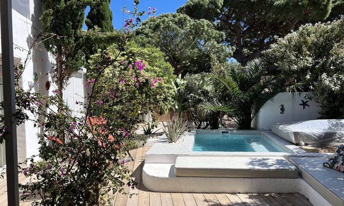 Exceptionnel à la Capte,face aux Iles d’or et a 100 m de la plage de sable fin ,charmante villa deux chambres entièrement rénovée avec goût.Détendez-vous dans ce logement calme et élégant avec petite piscine d’agrément et jardinet aménagé .