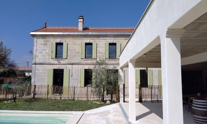 Located in the northeast of Gironde, at the gateway to the Charente and Charente-Maritime departments, about thirty kilometers from Saint-Emilion and sixty kilometers from Bordeaux, La Caquetoire welcomes you for your stay with family or friends. This location is ideal for discovering the riches of the Libourne region and enjoying a variety of pleasures and activities (canoeing, kayaking, bike rides, exploring towns and villages, wine estates and châteaux, etc.). Our cottage is housed in a beautiful, fully renovated, typical Gironde house dating from 1900. It is located in the small town of Eglisottes and Chalaures, near the main road, which takes you directly to the nearest shops, about 7 km away. The nearby train station, very convenient in summer, will take you to Bordeaux, Angoulême, or the beaches of Arcachon Bay. Our cottage features a beautiful private 4 x 8 m swimming pool (1.40 m deep) surrounded by a large pool house with a summer kitchen (dishwasher, sink, griddle, hob, refrigerator, pizza oven), a dining area, an outdoor shower, and a toilet. The cottage comprises a fully equipped kitchen and utility room on the ground floor, a bright living/dining room opening onto a terrace with garden furniture at the rear, a bedroom with a 180x200 cm bed and its own private shower room/toilet, and a separate toilet. Upstairs, there are four other bedrooms (one 140x200 cm bed, two 160x200 cm beds, and two 90x200 cm beds), three of which have private shower rooms and a fourth has a bathroom. The cottage features reversible air conditioning in the living areas. Free Wi-Fi and free private parking are available on the property. Bed linens are included in the price of your stay. Bathroom and pool linen rentals and end-of-stay cleaning are available (fee-based services apply). To make your stay easier, house rules will be provided upon arrival.