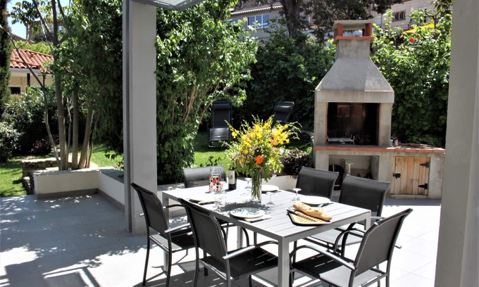 You dream of nature and calm! Come and discover, in the Aspres, between Thuir and Céret our cottage, labeled cottages of France 3 ears and classified 3 stars. You will stay in a comfortable villa of 80m2, spacious and sunny. Enjoy its enclosed garden of 700m2 with trees and flowers in the heart of the typical Catalan village of Llauro nicknamed «the balcony of Aspres» because it offers a magnificent view of the plain of Roussillon and the Mediterranean Sea. What a pleasure to grill meat and fish on the embers (branches, stumps and charcoal available)! You will have the choice between barbecue or plancha. 50m from the cottage, you will appreciate "Bistrot" where you can order a different meal every day on site or to take away, buy fruits and vegetables from our region, deposit: bread, croissants. You can stroll to the markets of Céret and Thuir, hiking in the countryside, cycling, relax at the leisure center of Saint Jean Pla de Corts (lake, swimming, animation), you will visit the Byrrh cellars in Thuir and, for art lovers, the Museum of Modern Art in Céret and many other places. Kitchen with living room and lounge open on 2 large terraces overlooking the garden, 1 bedroom with desk and 160cm bed, 1 bedroom with TV and 2 beds in 90cm, bathroom with 2 sinks and large shower, toilet indep. Closed private parking. Closed room for bicycles (4 bicycles lent free). A playground in the courtyard of the nearby school is open to all outside school hours. There is possibility to rent nearby the cottage "La Casa Del Pou" 6 people managed by the same owners.