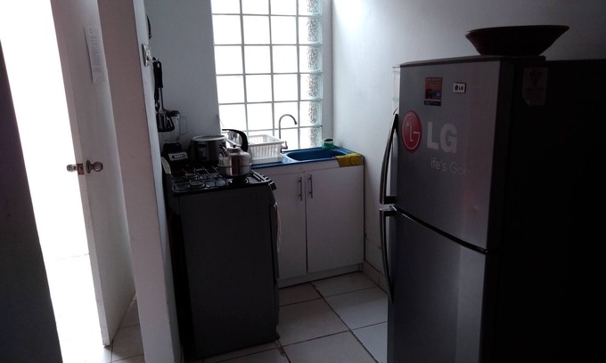 Cómodo departamento de un dormitorio con una cama matrimonial dos mesas de noche y una cómoda con espejo, un televisor pantalla plana, tiene un comedor para cuatro personas y menaje para cuatro, cuenta con un baño con agua caliente, el área de la cocina cuenta con una cocina de cuatro hornillas y horno , un refrigerador, olla arrocera, hervidor, olla, sartén . La sala tiene un sofá cama y una cama de una plaza. Cuenta con WiFi y cable satelital.