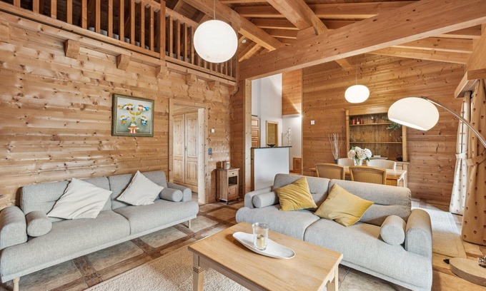 Beautiful 3.5-room apartment with all amenities (83m2) in a large chalet comprising 3 apartments, with mountain views and full South orientation for optimal sunlight. Maximum comfortable occupancy 4 people (+possibility of 2 additional persons in mezzanine). Quiet environment. Easy access in winter and summer. Common underground garage for the 3 apartments in the chalet, with elevator to the apartment. Closed ski storage room.The accommodation is equipped with high-quality furniture for guaranteed comfort.Description: entrance hall, open fitted kitchen, very bright living room with dining area and living room corner with Scandinavian stove, staircase/ladder giving access to a mezzanine with 3 basic sleeping spaces,1 bedroom with double bed (180/200),1 bedroom with 2 single beds (2*90/200),1 bathroom with bathtub and toilet adjacent to both bedrooms.The living room opens onto a large balcony with magnificent mountain view.Various equipment: heating by heat pump, TV, WIFI, dishwasher.No pets allowed. Non-smoking accommodation.Bedding: 2 duvets 150/200, 1 duvet 220/240, 4 pillows 50/60