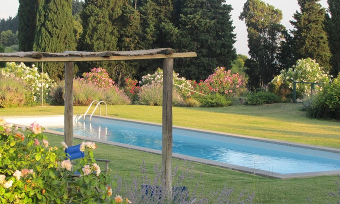 The I Cipressi apartment occupies the western half of the first floor of the house although it is accessed via an independent entrance. In addition to a large sitting/dining room with fireplace and spacious/fully equipped kitchen, the apartment features one double bedroom served by a bathroom with jacuzzi tub and a twin bedroom with en-suite shower room. The apartment is extremely cozy and functional and its garden is furnished with table and chairs for nice al fresco dining and with barbecue.