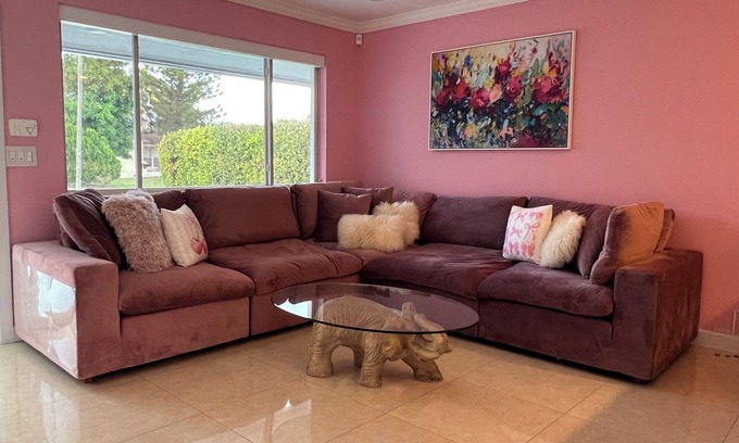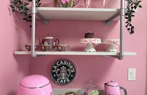 Its location serves as the perfect spot to celebrate all girls events and trips, including bachelorettes, birthdays, bridal showers, women retreats, and more, all year long. The color pink is the unifying theme of this four-bedroom, two baths vacation rental. From high-end retro pink and rose pink appliances in the kitchen, to an oversized dusty rose velvety sectional in the living room, to an eclectic pink cafe and mimosa bar, to unique fuchsia wallpapers. The space is also filled with fun decor like pop portraits, a rotary phone, and a most favorite gumbo machine. Every bedroom has been uniquely decorated and can comfortably sleep 8 people in very cozy beds. The backyard of this beautiful home includes a swimming pool and the most elegant outdoor kitchen counter top in a soft bubblegum pink; hosting a grill, mini fridge and wet bar.