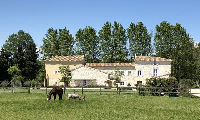 Large family suite for max. 5 people or for a couple, in an exceptional house in the heart of Provence. A haven of peace with swimming pool, large garden, terraces, hammock, playground, .... The farmhouse is completely renovated with beautiful materials. It is surrounded by meadows with horses and lavender fields. With a view of Mont Ventoux. Come to rest or come and discover the beautiful region! Only one room on the property, you can enjoy everything without sharing! The room is not suitable for children 2-5 years old compared to the stairs. Close to Îsle-Sur-La-Sorgue, known for its antiques, Avignon (TGV), Marseille (airport) and Mont Ventoux.