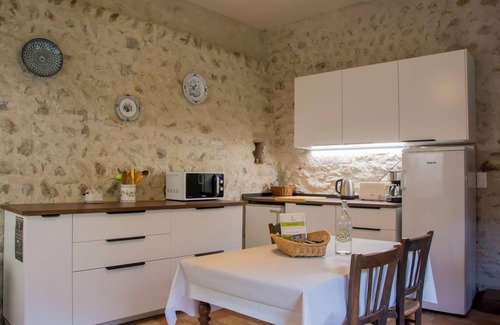 The kitchen and vaulted hall open onto the outside, giving direct access to the gîte's garden in fine weather for convivial outdoor meals.