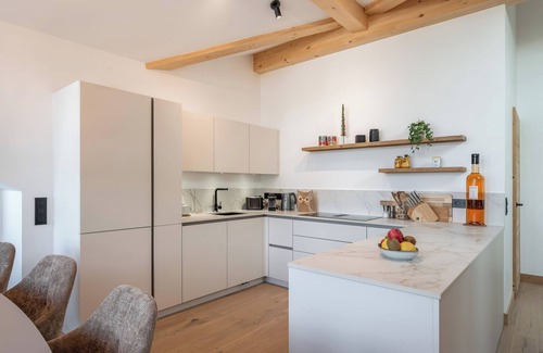 In the brand-new residence NAOS 1570, discover your mountain base, Apartment La Chouette. This stylish apartment features four en-suite bedrooms, one of which is a studio with its own kitchenette, making La Chouette ideal for families or groups of friends seeking comfort and privacy. Stay warm with the fireplace in the heart of the living area, where you can snuggle up for a movie night in front of the Smart TV. Then, step out onto the balcony for a nightcap as you take in the surrounding mountain views.