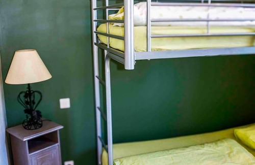Duplex of 80 m2 for 1 to 6 people comprising: living room with sofa bed, TV and integrated DVD, fully equipped kitchen, bathroom with washbasin and shower, separate toilet, large bedroom with 160 cm bed, bedroom with bunk bed for 3 people (double and single), extra bed possible, terrace with parasol, table and garden furniture, private entrance. The swimming pool, gym, sauna, laundry room and petanque area are available to guests in all 5 gîtes. Air conditioning in every room, Wi-Fi, linen, towels and end-of-stay cleaning included.