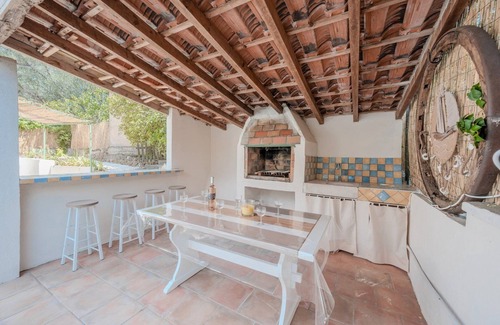 • Covered summer kitchen with barbecue, sink, bar with stools, and dining table.