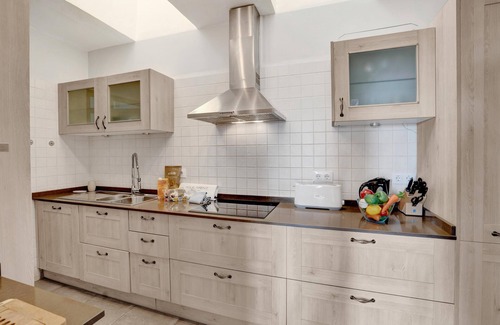 - kitchen with electric hob, electric oven, microwave, dishwasher, refrigerator-freezer, coffee machine, electric kettle, mixer, toaster and juicer