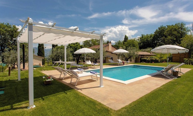 La Collina degli Ulivi is a charming farmhouse dating back to the 1800s, recently renovated and nestled in the peaceful hills near Montefalco, Umbria. Surrounded by olive trees, tall trees, and vibrant gardens, the villa is a perfect retreat for families and groups. The property features a unique blend of rustic and elegant design elements, including wooden beam ceilings and traditional details. Its strategic location offers stunning views over Spello and Mount Subasio, making it an ideal base for exploring the medieval towns of Umbria — the green heart of Italy. N.B. The owners, very discreet, sometimes occupy a part of the villa, with a private gate and fence in an independent position. They do not share any of the house's outdoor spaces, garden, or swimming pool with guests. Note: the owners, who are very discreet, may occasionally stay in a completely independent portion of the property, with a private, gated entrance and separate access. They do not share any of the outdoor spaces with guests, including the garden, swimming pool, or common areas of the villa.
