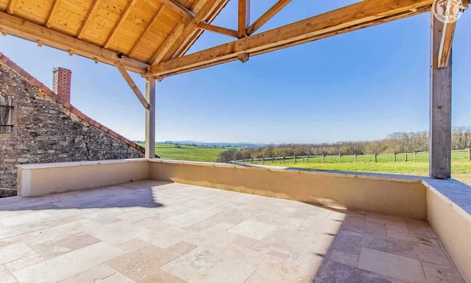 Charming traditional residence of character dating from the 19th century, very carefully restored in the rules of the art & steeped in history (formerly linked to an important local farm), quietly located in the middle of the hilly countryside in the hollow of a sublime preserved setting of greenery & nature, on the immediate edge of pastures & meadows (with the famous Charolais cows as the only privileged neighbours), not far from the peaceful little typical village of Martigny-le-Comte (& its Romanesque church from the 12th century) & several vast wild forests. Beautiful exposure, perched "on a balcony" on the hillside, in a "panoramic belvedere" overlooking a vast plateau of bucolic bocage. Sumptuous unobstructed view of the surrounding countryside. Exceptional setting & landscaped site, 100% soothing & restful. Magnificent panorama & postcard rural landscape. Comfortable high standard gite. Ultra spacious. Beautiful volumes of the living rooms. Rooms with noble dimensions. Very elegant country character with contemporary accents, opulent & refined, enhanced by a particularly careful heritage restoration (conservation of the old stone walls, stone & wood lintels, fireplace mantels, original floor tiles etc.). Lots of charm. Very cozy, cozy & cocooning atmosphere. Large sheltered panoramic terrace. Vast & pleasant lawned garden. Composition: Detached house on 2 levels. Wireless. Heat pump heating. Double wood stove. Air conditioning upstairs. Ground floor: living room-kitchen, lounge, bedroom (double bed 160x200cm) with "open" private shower room (shower/WC), separate WC. 1st floor: large mezzanine/playroom area, 3 bedrooms (2 single beds 90x190cm / double bed 160x200cm / 2 single beds 90x190cm) including one with private "open" bathroom (shower + bath + WC ), bathroom (shower), separate toilet. Sheltered terrace + courtyard + garden + bike room + private parking. Supermarket at 10 km. All amenities 15 km. Station 25 km.