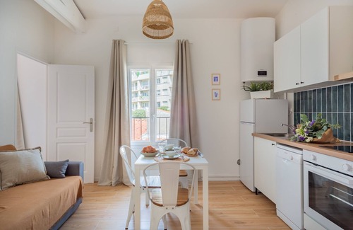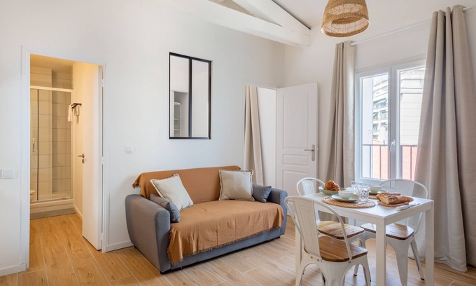 Cocoonr offers this charming T2 apartment for rent, located near the Old Port and the Catalans beach. This fully equipped and air-conditioned flat was refurbished in 2024 and can accommodate two travelers. Located on the 3ᵉ floor (with lift), it comprises a living room, an open-plan kitchen, a beautiful bedroom and a shower room.