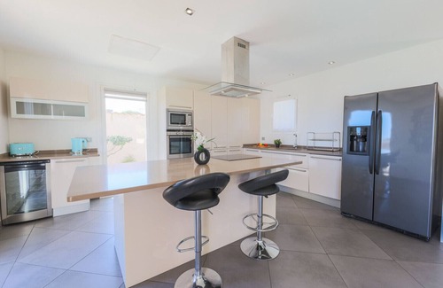 This villa has quality furnishings and comprises an open-plan fully equipped kitchen opening onto the living room with dining area, 3 bedrooms, 2 bedrooms with 1 Queen size bed (160 cm) each and the 3rd with a double bed (140 cm) and 2 bathrooms with bathtub as well as 4 toilets. A laundry room with washing machine and tumble dryer is located in the basement. It is fully air-conditioned.