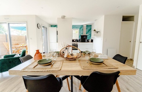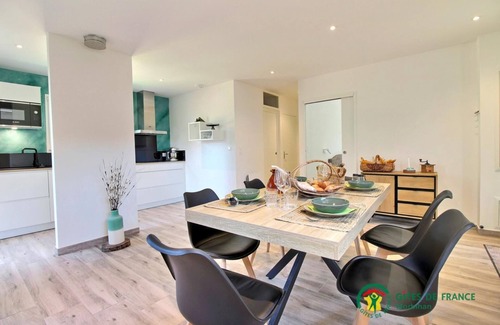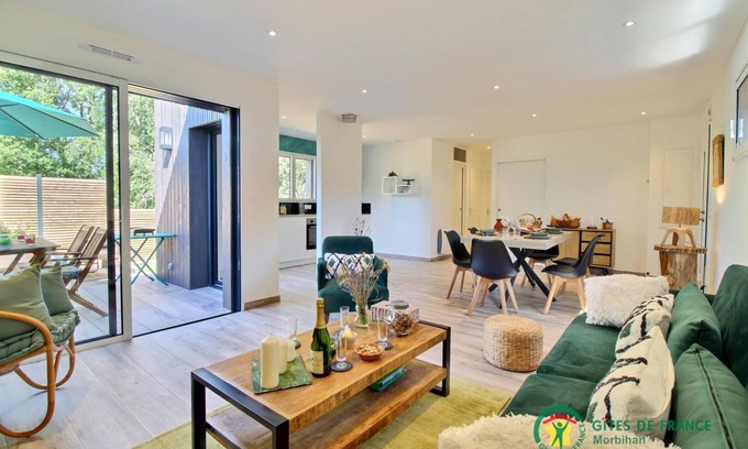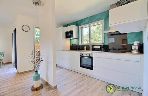 This contemporary and independent holiday home is laid out on one level. It offers you: a large living room with kitchen, living room and lounge, a bedroom with 1 bed 160 x 200 (divisible into 2 x 80) with adjoining shower room, a bedroom (1 bed 160 x 200) with adjoining shower room/wc, a laundry room and a separate toilet with washbasin. Outside: an equipped terrace, a synthetic garden and a gravelled courtyard with parking space. Next to the cottage is rental 56G5821 (4 people) and the owners. Between Vannes and Nantes, between the Rhuys peninsula and the Guérandaise peninsula, come and recharge your batteries in Férel for your next vacation. La Vilaine will allow you to practice water sports (sailing, canoeing) and boat trips. For your beach days, Pénestin with its 25 kilometers of coastline and its dozens of beaches - including that of La Mine d'Or - is the ideal place! Less than 30 minutes away, the Brière, the salt marshes and the Gulf of Morbihan will be within your reach.