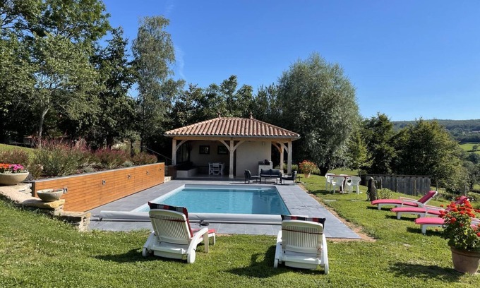Elegant residence of character from 1690 steeped in history, family property since the 18th century, formerly a wine farm linked to the Abbey of Cluny, quietly located in the rolling countryside in the heart of a peaceful little hamlet leaning against an exposed hillside, in the heart of a bucolic bocage cirque nestled under the wooded hills overlooking Cluny. Magnificent preserved setting of nature & greenery, between meadows, vineyards & forests, literal haven of peace & rest nestled in the heart of a site classified as Natura 2000 Zone. Beautiful unobstructed view of the surrounding countryside. Superb panorama & landscapes. Exceptional private estate of 30 ha, largely "natural" (including a fishing pond with carp & roach and a large forest dotted with hiking trails), including a pleasant enclosed park of 5000m² with trees centenarians carefully designed (welcoming a donkey, a pony & an arboretum rich in more than ten varieties) equipped with a beautiful heated swimming pool (9x4.5m) and numerous fun areas for rest & relaxation. Spacious, comfortable gîte. Beautiful volumes. Warm country character combining the atmosphere of a family home, the charm of authenticity & the exotic atmosphere of an old home (fireplace mantle, French ceilings, original cupboard doors, etc.). Large balcony-terrace sheltered in a traditional Mâconnaise gallery. Lovely private garden, grassy, with trees & vegetation (reserved space on the park). Composition: House comprising 2 gîtes (total independence not overlooked) adjoining the owner's home (in annex). Gite on the 1st floor. Wireless. Electric heating + wood stove. Kitchen, living room, 2 bedrooms (double bed 160x200cm / 3 single beds 90x190cm), bathroom (shower), separate WC. Laundry room on the ground floor. Private balcony-terrace + garden (reserved space on park). Enclosed grounds (with ping-pong table) + shared heated swimming pool (9x4.5m) for the 2 gîtes. Shaded private parking. Amenities 9 km.