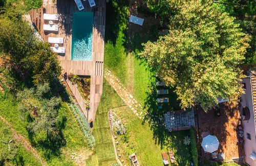 La Dama del Bosco stands on the hills above Pietrasanta, among a small group of houses, inheritors of a small medieval borgo. The property overlooks the long Versilia coast and, looking towards the west, it is also possible to see the Gulf of Lerici. Surrounded by a wood of centuries-old chestnut trees, the house is located halfway between the golden beaches and the white Apuan Alps, adorned like a crown by the quarries of the renowned Carrara marble. On arrival you will find three houses in front of you, yours is the central one, with living area, swimming pool and garden at the rear, with maximum privacy, for your unforgettable holiday very close to the borgo of Capriglia. The property is an excellent starting point for countless routes along which you will discover unique corners that will give you unforgettable moments of relaxation, framing memorable views. The house has been completely renovated by the owners, following an accurate project that has perfectly combined tradition and modernity, providing the guidelines for the restoration. However, it was decided to preserve traditional Tuscan materials such as pietra serena, ceilings with exposed beams and tiles, refined finishes of the internal walls. All the rooms have been lightened with simple elegant furniture, enhanced in perfect harmony with the pastel tones of the walls and with the precious decorative details that enrich every corner of the house, creating a hospitable atmosphere. The location of the house will allow you to reach the renowned destinations of the coast such as nearby Pietrasanta, Forte dei Marmi, Viareggio, Lerici and the Cinque Terre, UNESCO World Heritage site, as well as the famous tourist towns of Tuscany like Florence, Lucca, Pisa, Montecatini Terme or Torre del Lago overlooking Lake Massaciuccoli which was the home and source of inspiration of the great Maestro Giacomo Puccini, without forgetting nearby Colonnata, famous for its IGP lard.