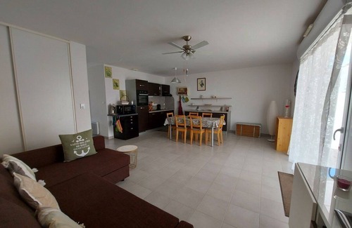 Elle se compose d'une pièce de vie avec canapé d'angle convertible en lit 140, TV, cuisine (réfrigérateur freezer, plaque 2 feux induction, four électrique, micro-ondes, lave-vaisselle), une chambre avec 1 lit 160 et TV, salle d'eau (lavabo, douche), WC, garage avec LL. Cour avec terrasse et store banne à l'arrière de la maison avec salon de jardin. Une place de parking privée et un box de stockage.