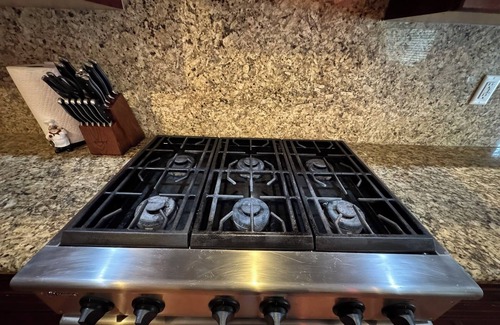 The kitchen has three stools that pull up to the granite island with specialty drop lighting above. You will find a microwave, Keurig and Kitchenaid for your use. The stove is a 6-burner. There is also a small tall-top dinette that seats four people.