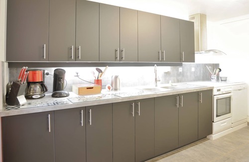 - a kitchen with oven, gas hob, fridge, microwave, coffee maker and everything you need to cook, as well as a washing machine. The kitchen is in trendy black and white tones.