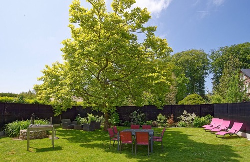 outside, a garden with garden furniture, deck chairs and barbecue.