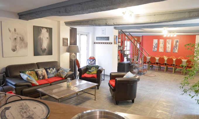 - a large living room and dining room of 61 m² with TV, wood stove and a large living room which opens directly onto the garden. It is decorated in the theme of horses and cows which reflects the omnipresent nature in our region. And you have at your disposal a large bar