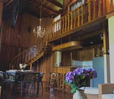 Providing a garden, La Fontana Cabaña - Oxapampa features accommodations in Oxapampa. This property offers access to a balcony, free private parking, and free Wifi. Featuring a terrace and mountain views, the spacious vacation home includes 5 bedrooms, a living room, flat-screen TV, an equipped kitchen, and 2 bathrooms with a bath and a shower. There's also a seating area and a fireplace. The vacation home has a picnic area where you can spend the day outdoors. Francisco Carle Airport is 130 miles from the property.