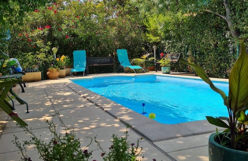 1 veranda opening entirely on garden and seen on swimming pool - Swimming pool reserved to our holiday makers (there is only one location) - For the amateurs cyclists: the cycle track is with 4mn. Bus stop 1mn. Mountain, sea and beaches nearby (5 minutes by car separates us from the first beach) Main shops 2mn. (on foot) .. Parking - wi-fi (free). The Guard whose medieval old town is located on a rock is geographically well located for all the activities Festivals (shows and concerts offered by the Commune) and Markets Provençaux (3 markets / week for it alone). Beginning AUGUST: spectacular Medieval festival in the city center, during 5 days; Add to this the Provençal scents accompanied by the song of Cigales.