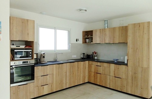 Aménagement moderne, séjour donnant sur une terrasse , coin cuisine aménagé et équipé ( Lave-vaisselle, réfrigérateur, plaque induction, four, micro-ondes) trois chambres avec lits doubles ( 2 lits en 160 et 1 en 2X90 ), salle d'eau avec WC, WC. Jardin clos avec terrasse, stationnement et acces entierement cloturé par un portail motorisé.