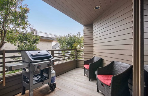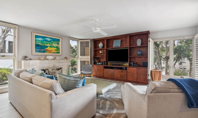 The first floor features two spacious bedrooms. The primary bedroom boasts a king bed, flat screen TV, and an en-suite bathroom with a glass-enclosed shower and soaking tub, dual vanity, and luxurious finishes. The second bedroom offers a cozy double bed, flat screen TV, and an en suite bathroom with a glass-enclosed shower. Upstairs, you'll find a spacious family room with multiple seating options, a flat screen TV, and a fireplace, perfect for relaxing evenings. The family room flows seamlessly into the dining area, which seats five. Enjoy meals at a stylish dining table for five, or at the bar that peers into the kitchen with seating for four. A gourmet kitchen awaits, complete with stainless steel appliances, and a large island with seating for six. This setup is ideal for casual dining and entertaining. Off the living room, you'll find a lovely balcony with lounge seating, offering a great spot to unwind and enjoy the fresh sea breeze. Additional amenities include a washer and dryer in the unit, two parking spaces in the secure subterranean garage, and air conditioning to stay cool year-round. Accessible from the ground floor, there's also an outdoor patio, perfect for morning coffee or an evening drink. You will love the beach essentials for your stay as well - boogie boards, beach chairs, and an umbrella are available for use. This La Jolla gem is not only steps away from stunning La Jolla Cove, but it also provides a tranquil retreat after a day of exploring. Whether you're here for the sun, the surf, or the serene environment, this home offers everything you need for a perfect stay. Book your stay today and experience the best of La Jolla living!
