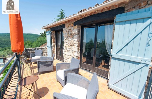 Le Mas du Bois Dore consists of 4 Luxury Gites (apartments) attached to an 1823 built stone Mas. There are 2 x 2 bedroom gites that were totally remodeled and 2 x 1 bedroom apartment all decorated by a professional interior decorator with French antique decor.