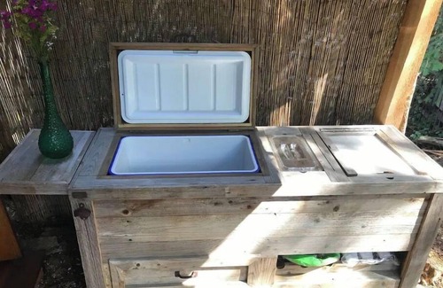 There are pans, dishes, silver ware, olive oil, salt and pepper, dish soap and a sink with running water. A Cooler that is built into a work top counter is also provided.