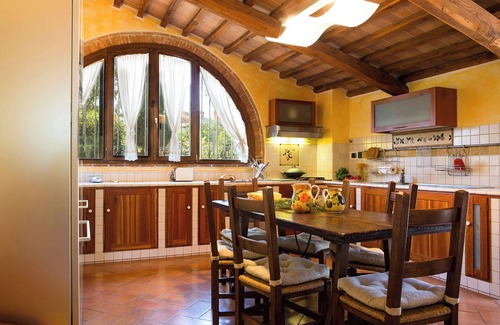 The beautiful fenced park surrounding the house, that measures about 12.000 square metres, is full of hedges marking the border and characteristic cypresses, the symbol par excellence of Tuscany. The well-kept English lawn has many paths flanking the house with areas of natural shade and lush fragrant plants like roses, oleanders and herbs. The external dining area is located between the house and the pool.Please notice that photos are taken in spring, therefore flower blossoming, and the colours of the gardens' grass could be different at the moment of your arrival at the villa.