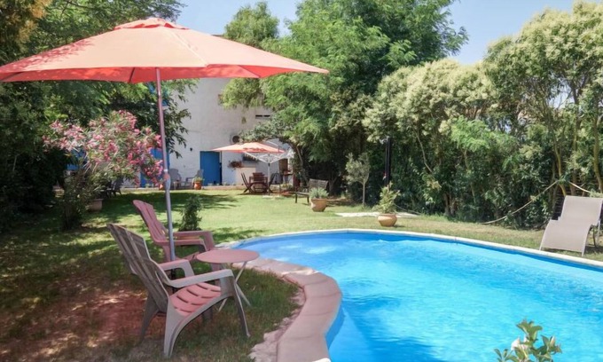 Mas "La maison d'Adélaïde". Outside the resort, 10 km from the centre of Saint Laurent d'Aigouze, 12 km from the sea. For shared use: property 1 ha. Garden furniture. Private: swimming pool kidney shaped (20 m2, depth 150 cm, seasonal availability: 01.Apr. - 30.Sep.) with internal staircase and alarm system. Parking on the premises. Shop 6 km, supermarket 6 km, bus stop 10 km, railway station 10 km. Please note: car recommended. The owner lives in the same residence.
