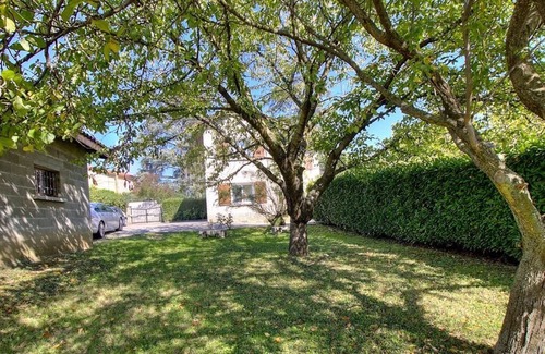 City Break accommodation in totally detached house with extensive shady garden. Peaceful & residential setting, just 500m walking from the university teaching Lyon Sud Hospital. Very easily accessed via motorway and public transport (Bus lines N°88 & 17 nearby). Very confortable & well-designed accommodation on 2 floors. Light & airy, every rooms of the ground floor (except laundry room) have a direct outdoor access. Ground floor : entrance hall, WC, separate kitchen, laundry room, living room (dining area, lounge area). Upstairs : hall, 3 bedrooms (double bed) (2 single beds) (2 single beds), bathroom, WC. Outdoors : large shady garden (fruit trees), climbing frame, 2 paved terraces, garden furniture. Parking on property (electric gate).