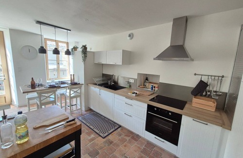 -> A dining area and a fully equipped kitchen (stove, hood, microwave, oven, fridge, dishwasher, toaster, coffee maker, kettle…). Everything you need to cook is provided. A welcome kit is offered, including tea, coffee, sugar, and biscuits.