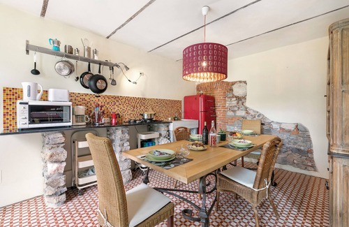 On the ground floor, there is an attractive sitting room with loft-style unplastered brick and stone walls and a charming tiled floor. The sitting room is furnished with two sofas and a flat-screen TV. French windows lead directly onto the garden. An open staircase leads up to the mezzanine bedroom and bathroom. The airy kitchen/dining room is down a short flight of steps and is decorated in a similar style with partly plastered walls and contemporary/rustic furniture. The kitchen is equipped with a cooker hob, oven, large fridge/freezer and a coffee machine. Plus a large dining table with 4 chairs. Double doors open onto the terrace.