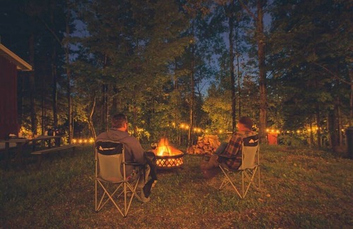 À l'extérieur, vous pourrez profiter d'un foyer au bois avec une grille de cuisson pour des repas en plein air, ainsi que d'un mobilier extérieur pour vous détendre et admirer la nature environnante. De plus, l'accès au lac est à proximité, vous permettant de vous rafraîchir et de pratiquer des activités aquatiques. Le stationnement est également disponible sur place.