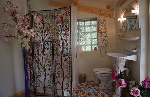 "the house" apart and very cocooning. it feels good with its ethereal sheer bed and its open bathroom decorated with Paris porcelain.