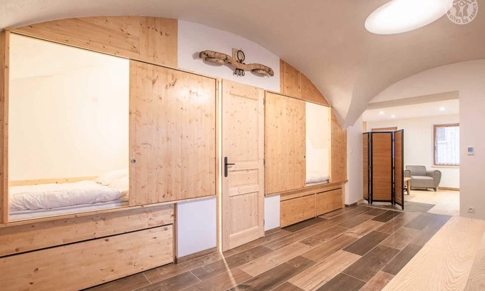 Gite in a semi-detached house, located on the ground floor comprising an entrance with ski room, a living room (a sofa bed for 2 people) opening onto a large living room with kitchen/dining area and 2 shepherd's enclosed beds (alcoves each comprising 1 double bed, closed by a sliding wooden door), a bathroom (bathtub with shower rod), separate WC. Public parking in front of the gite or at the entrance to the hamlet. The rental of sheets also includes the rental of towels. In the heart of a typical high-altitude hamlet, this former stable of a dwelling house has been completely restored, highlighting the vaulted ceiling of the vast living room-kitchen. A large table with benches like in a mountain refuge, comfort and modern equipment, this cottage is ideal for a base to discover the region on foot or on skis. Sheets are included. In winter, a shuttle is available to facilitate your travels and reach Champagny resort center.