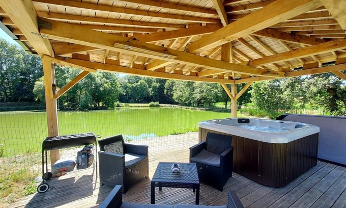 Upstairs, you will find a bedroom with a 140x190 bed, a bedroom with two 90x190 beds, a large bedroom with a 140x190 bed and a dressing room, a bathroom and a separate toilet. Storage is in the large dressing room in the adjoining hallway. Outside, you will enjoy a plot of just over 1 hectare with a terrace, a sheltered 6-person spa, a dining table, garden furniture, deckchairs, a barbecue and a parasol. A body of water of 5000 m² is present in front of the gîte. It is private for rent. The owners provide you with a pedal boat, 2 paddles and a boat. You have the possibility to park two vehicles in the garage as well as to store sports equipment. You will be asked for two deposit checks: a check for €1,000 for the house and a check for €300 for cleaning. 40 kilometers from Lorient, in authentic Brittany, the town of Le Faouët is full of enchanting sites thanks to its very hilly countryside, its forests and rivers. The hiking trails are numerous and will make you discover the architectural and natural heritage of this town. The property is as bucolic as you want, you will find all the comfort you need to spend a quiet holiday whether you are 2 or 10. On site, a multitude of activities are available to you: pedal boat, paddle, fishing, spa, hiking... For more activities on the water, the nautical base of Priziac, is only 10 km from the rental. This 180 m² holiday home, accessible via a few steps, consists of a fitted kitchen, a lounge/living room, a toilet with washbasin, a bathroom and two bedrooms with in each a bed 160x200.