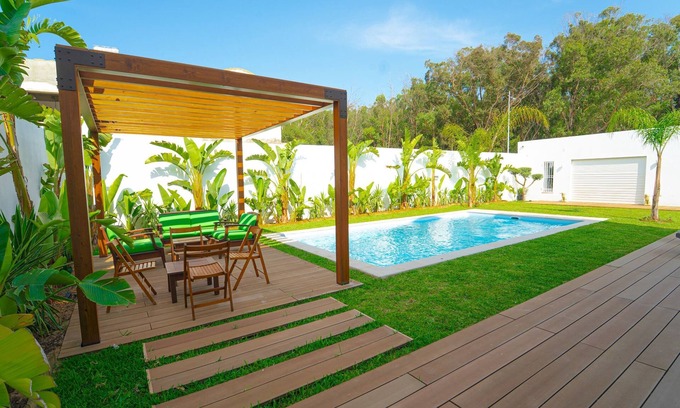 * A beautifully landscaped outdoor area with a pergola, garden furniture, and a private pool