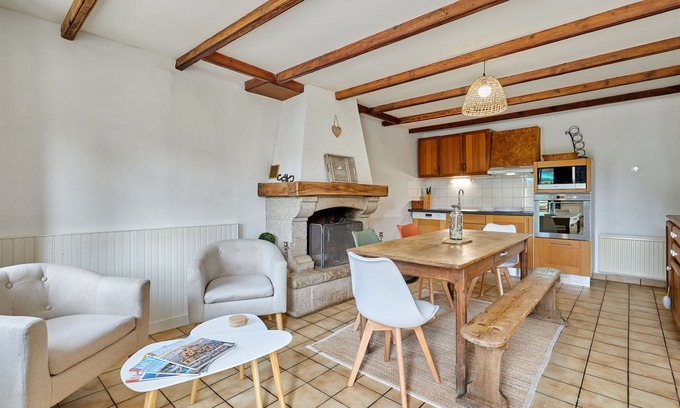 "La Marinière", 3-room house 90 m2. Beautiful and stylish furnishings: living/dining room with open-hearth fireplace and TV (flat screen). 1 room with 1 french bed (180 cm, length 200 cm). 1 room with 1 pull-out bed (2 pers. 2 x 90 cm, length 200 cm). Open kitchen (oven, toaster, kettle, microwave, electric coffee machine). Shower/WC. Electric heating. Facilities: washing machine. Internet (WiFi, free). Please note: maximum 1 pet/ dog allowed. Smoke alarm. Offer by a private individual according to Art. 155, IV of CGI.
