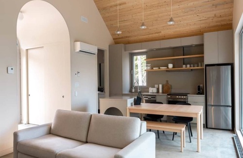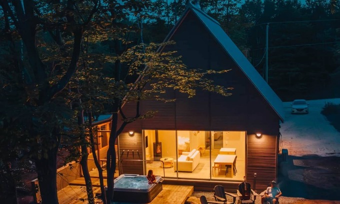 This 600-square-foot, "luxurious mini-home" style chalet offers a symbiosis of nature and architecture with exceptional mountain views. The entire design was created by the architectural firm Atelier L'Abri. You'll be charmed by the imposing arch at the entrance and the windows, giving the impression of blending into nature. Its minimalist grandeur and cozy decor make it the perfect place for a romantic getaway.