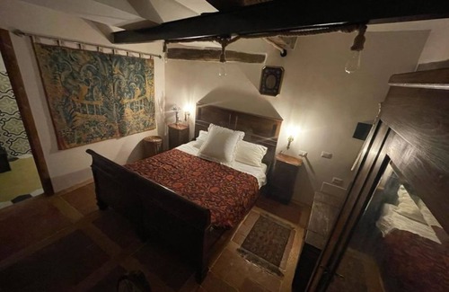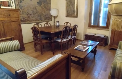 Suite apartment on the first floor, (sleeps 4) consisting of an equipped kitchen finished with hand-painted tiles, gas cooking area, refrigerator, and spacious fireplace. Large living room furnished with antique furniture and sofas, double bedroom with canopied double bed with an additional single bed and an antique cradle for a baby, bedroom with single bed, bathroom with spacious mosaic shower. Available covered outdoor terrace with rattan table and armchairs for the exclusive use of the apartment. All rooms offer accurate finishes and a warm welcome with oak parquet flooring, double-glazed chestnut windows and antique wooden furniture. This solution is suitable for families and/or groups of friends.