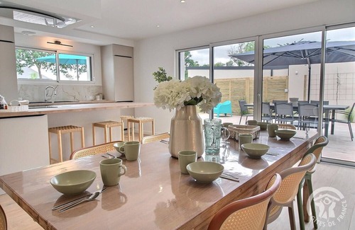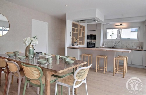 Your holiday home is spread over two levels: On the ground floor : You will find an entrance hall, a pleasant living room including a lounge, a living room and a kitchen opening onto a beautiful terrace, A laundry room equipped with a sink and a washing machine, A separate toilet with hand basin, A dressing room, a bathroom with shower, A bedroom with a 160x200 bed with direct access to the terrace Upstairs : A bedroom with a 160x200 bed, A children's bedroom with two 90x190 beds, Another bedroom with two 90x200 beds, An independent bathroom with bathtub and WC - Exteriors: Wooden terrace as well as another sliding terrace on rails, opening onto a heated swimming pool of 10 m² (3 x 4 m) and 1.5 m deep, available from April to October. Synthetic lawn of 150 m². Parking for 2 vehicles in the private car park with a Carport at the entrance to your rental. A garage to store your bicycles, motorcycles. Welcome to this magnificent modern house, adjoined by its garage with another house, located in a charming residential area, just a few steps from the famous coastal town of Binic. The pretty cabin room, upstairs, will offer your children a cozy refuge where they can give free rein to their imagination. It's their own space, where they can sleep, read, play. And what about the ideal location of this house? A stone's throw from the sea, it offers you privileged access to the pleasures of the beach and swimming. But that's not all ! Binic opens its arms to you with its picturesque port, its shops, its restaurants, etc. You can stroll along the quays, taste fresh seafood, and soak up the authentic atmosphere of this seaside town.