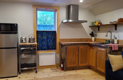 A main street 2nd floor Suite with thoughtful design to give you the feeling a home away from while traveling to the region. Your self contained private suite is equipped with a bedroom, full bathroom and a living area. The living are is equipped with a fully stocked kitchenette to prepare almost any meal, table and chairs, desk, Sofa and TV. You will also find a few little extras to keep you busy and make you feel at home. As you are right on main street, you can leave the car parked in the private driveway and walk to shops and restaurants.