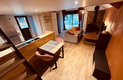 Elle dispose de 2 espaces extérieurs, terrasses et pergola et vous offre une entrée indépendante une cuisine aménagée et équipée, un séjour salon avec un poêle à granulé, une grande douche italienne avec un sauna, wc séparé. À l’étage un coin nuit en mezzanine avec un lit en 180x200. Barbecue salon de jardin à disposition