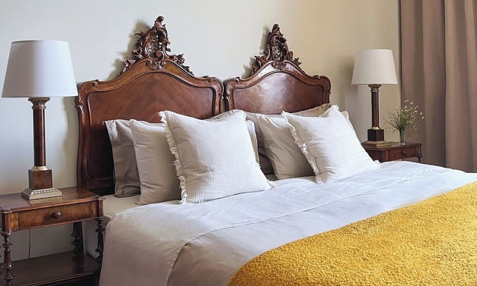 Featuring a sumptuous antique king-sized bed (or two twin beds, upon advance request) adorned with fine linens, down or synthetic pillows and down comforters. Featuring a large antique armour with complimentary coffee/tea bar, mini fridge with snacks and soft drinks (at an additional cost) Continental breakfast is included.The bathroom is shared with one other room and has a rain shower, bidet, large pedestal sink, luxury toiletries and soft towels.